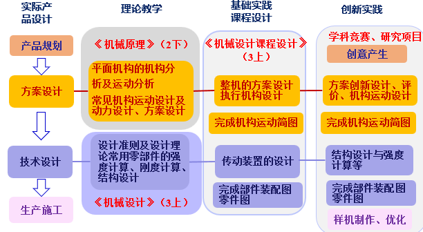 机械原理:北京化工大学1960年开设了此课程,先后经历了耿孝正、张美麟、张有忱、张莉彦等几代课程负责人的建设:(1)形成“项目牵引-问题驱动-能力导向”的育人模式,打破课程边界,重构课程体系,理论教学与实践(含课程设计)均以实际产品设计为主线同时展开,以整机方案、机构设计(注塑机、包装机等为例)将教学串接,教学任务从“知识传授型”向“能力培养型”转变;(2)开展以学生为中心、课内外结合的基于项目的研究性教学,提前布置研究项目,学生带着问题到课堂,提升学生学习的自主性和挑战度,课后机械创新实验室对学生开放,项目研究,动手动脑,提高学生的工程实践能力;(3)科教融合,更新教学内容,建设多样化教学资源,支撑研究性教学,建立线上学习系统、动画视频库、项目案例库等;(4)课程思政融入教学各环节,强化学生在制造强国战略中的责任意识和使命担当,实现价值塑造、知识传授和能力培养同向同行,在项目实践中理解、遵守工程伦理道德。