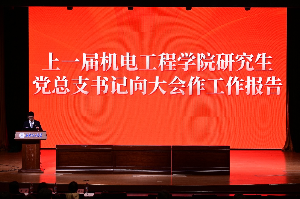侯蒙京同志代表上一届机电工程学院研究生党总支向大会作《强化思想引领 勇担强国使命,为提升新时代研究生拔尖创新人才培养质量而不懈奋斗》工作报告。报告系统总结了上一届研究生党总支在思想政治引领、基层组织建设、党员教育管理和服务研究生成长成才等方面取得的工作成效,认真梳理了经验做法,分析了当前面临的新形势、新任务,并对今后一段时期学院研究生党建工作作出了展望。