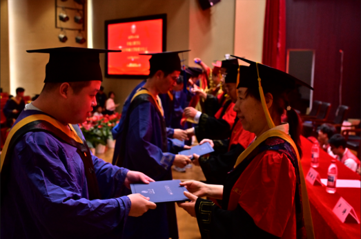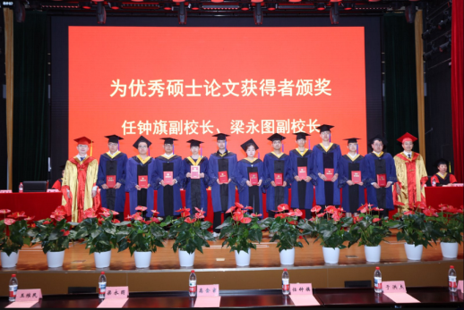 Wang Weimin also announced the list of master's degree recipients from the School of Mechanical and Electrical Engineering and the Department of Art and Design. Representatives of supervisors, including Gao Jinji, Ren Zhongqi, Liang Yongtu, Wang Weimin, Zhuang Yibing, Tang Gang, Xue Ping, Zhang Jianwen, Lu Tao, and Liang Lihong, turned the tassels and conferred degree certificates to all master's graduates, followed by group photos.